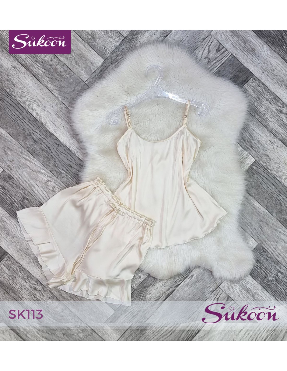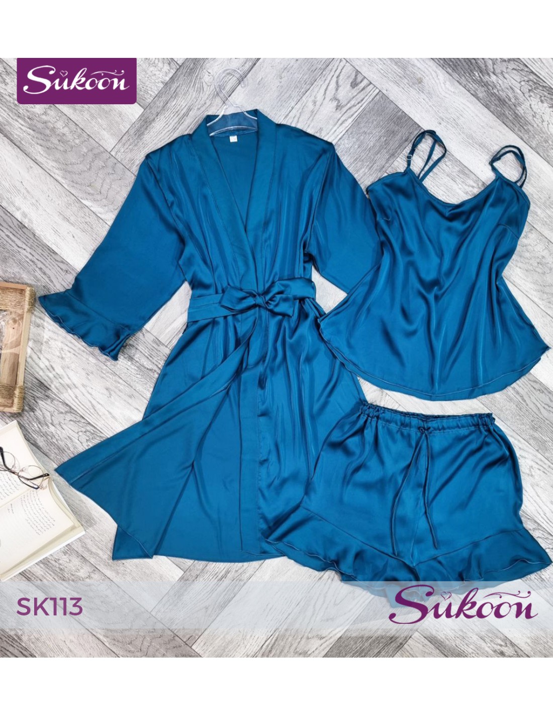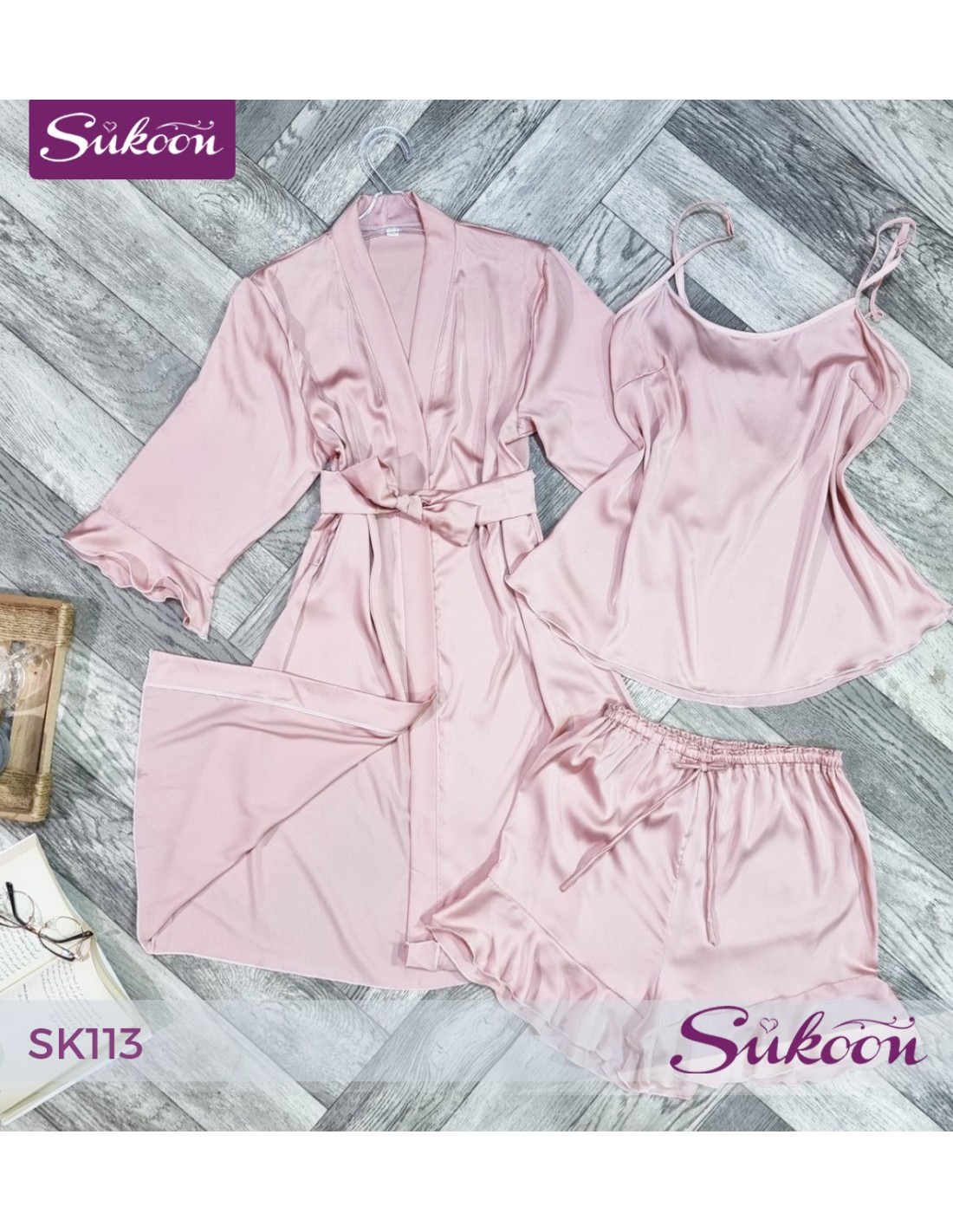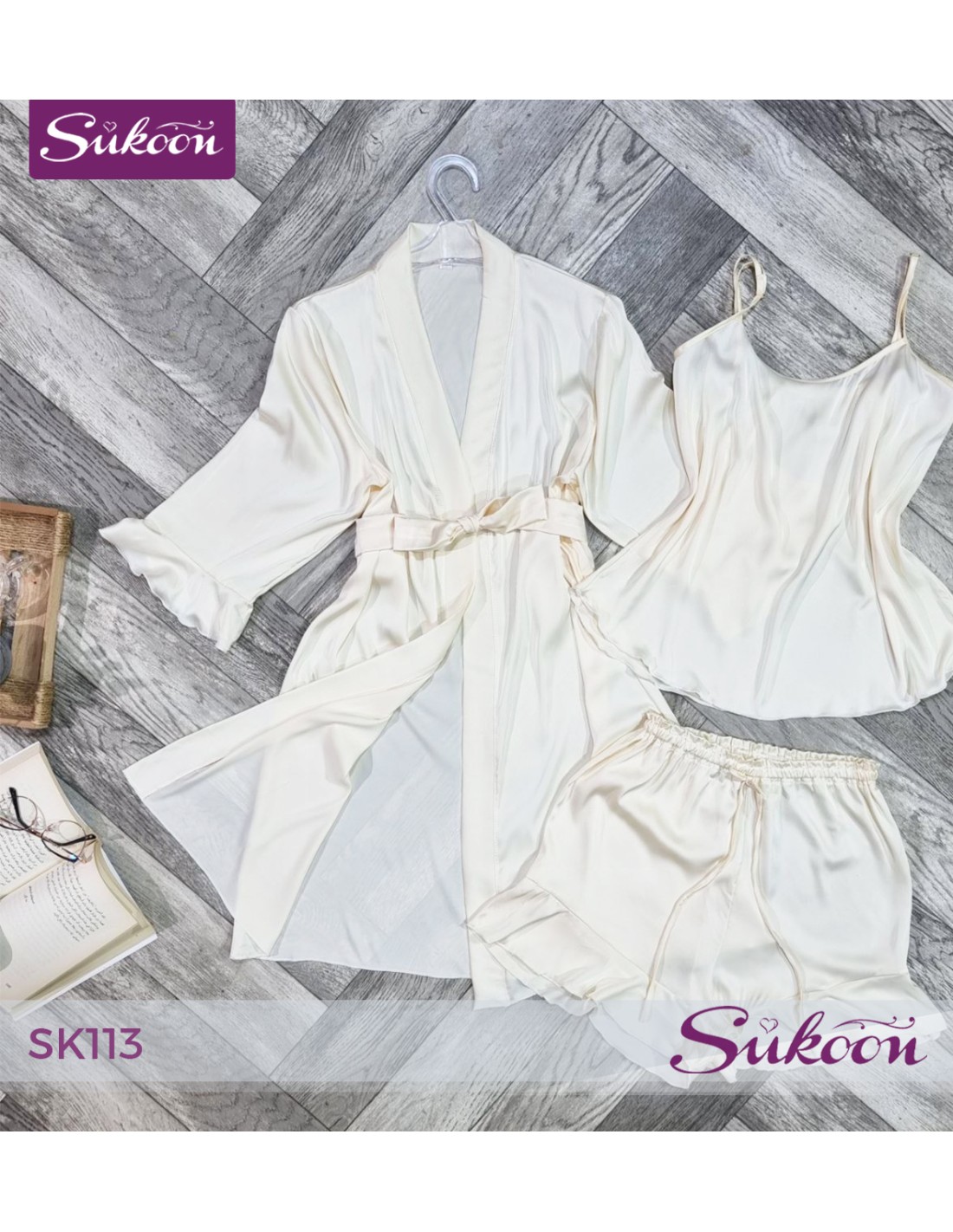 مع طقم بيجاما من 3 قطع بالساتان الناعم، استمتعي بجمال يجمع بين: