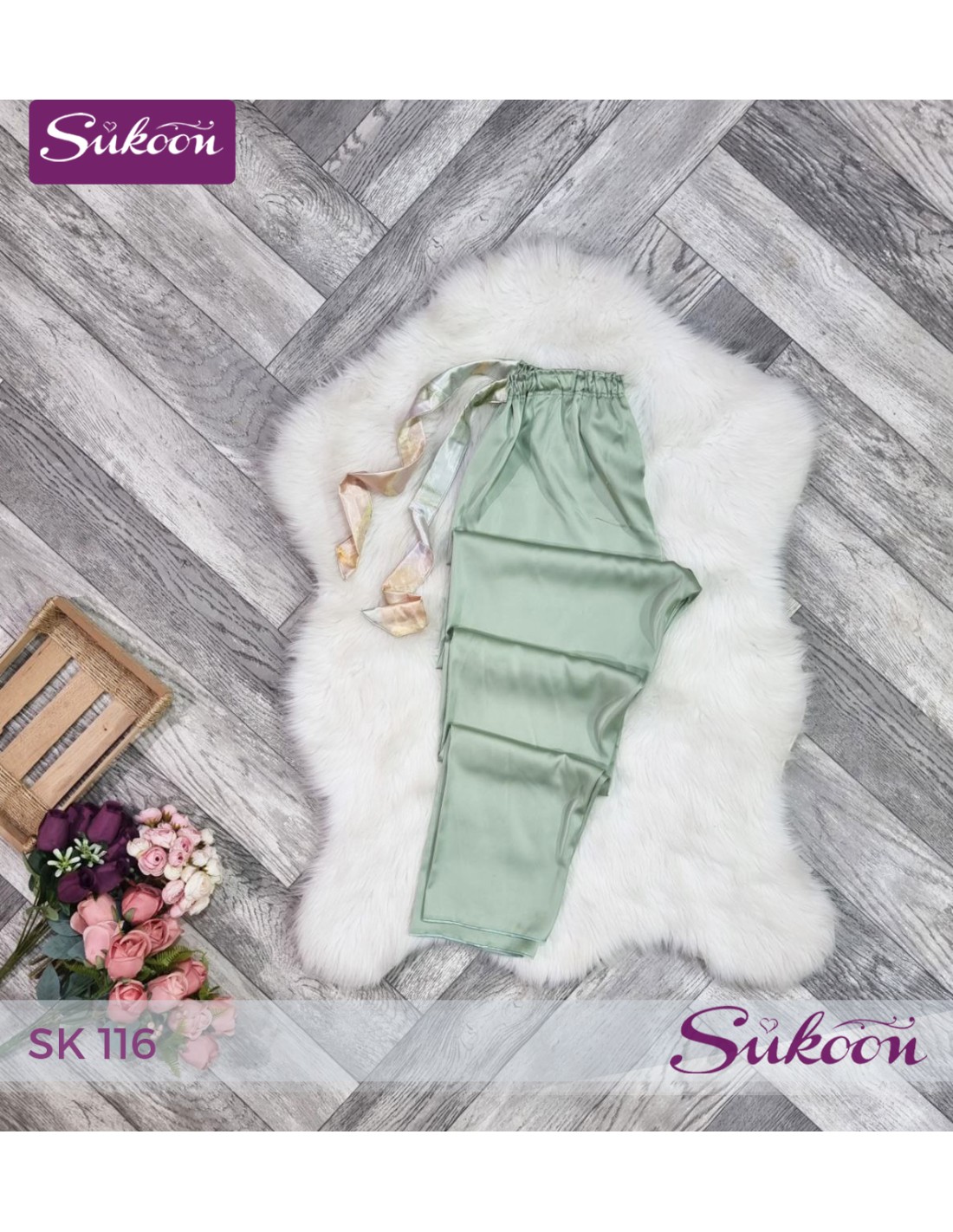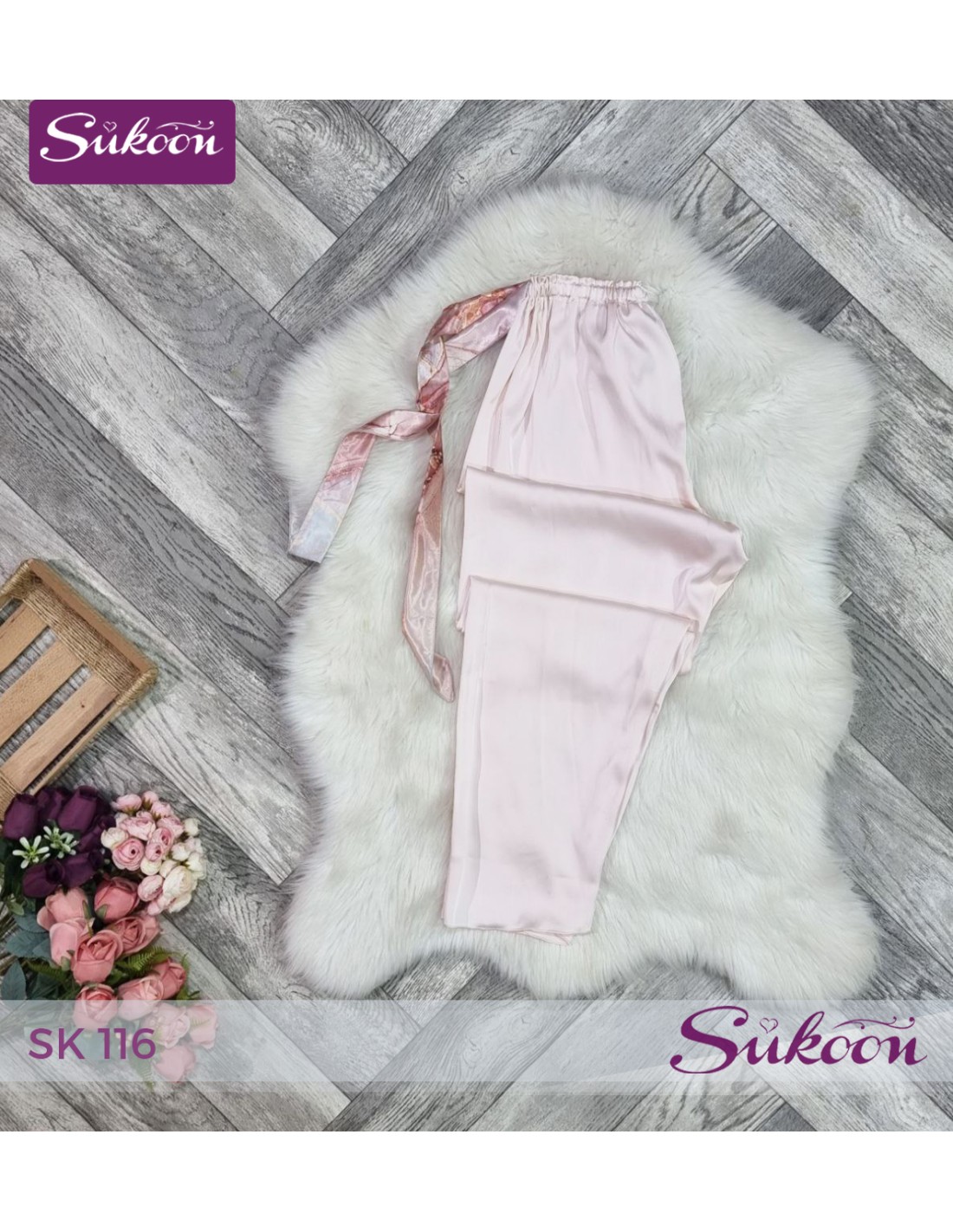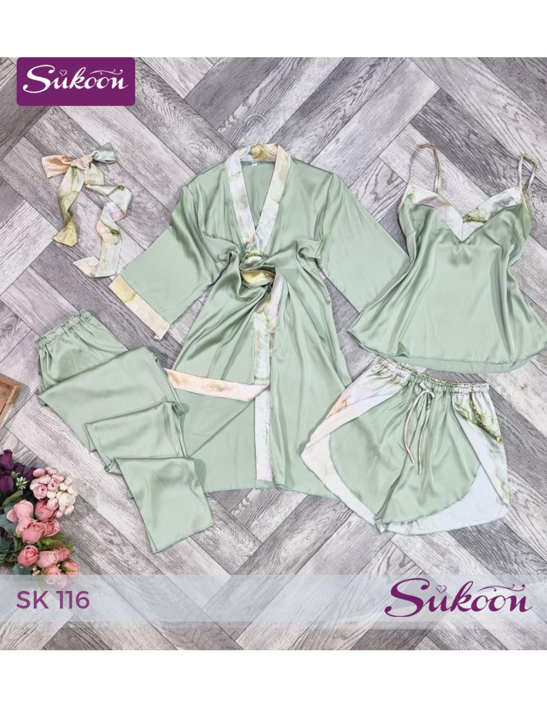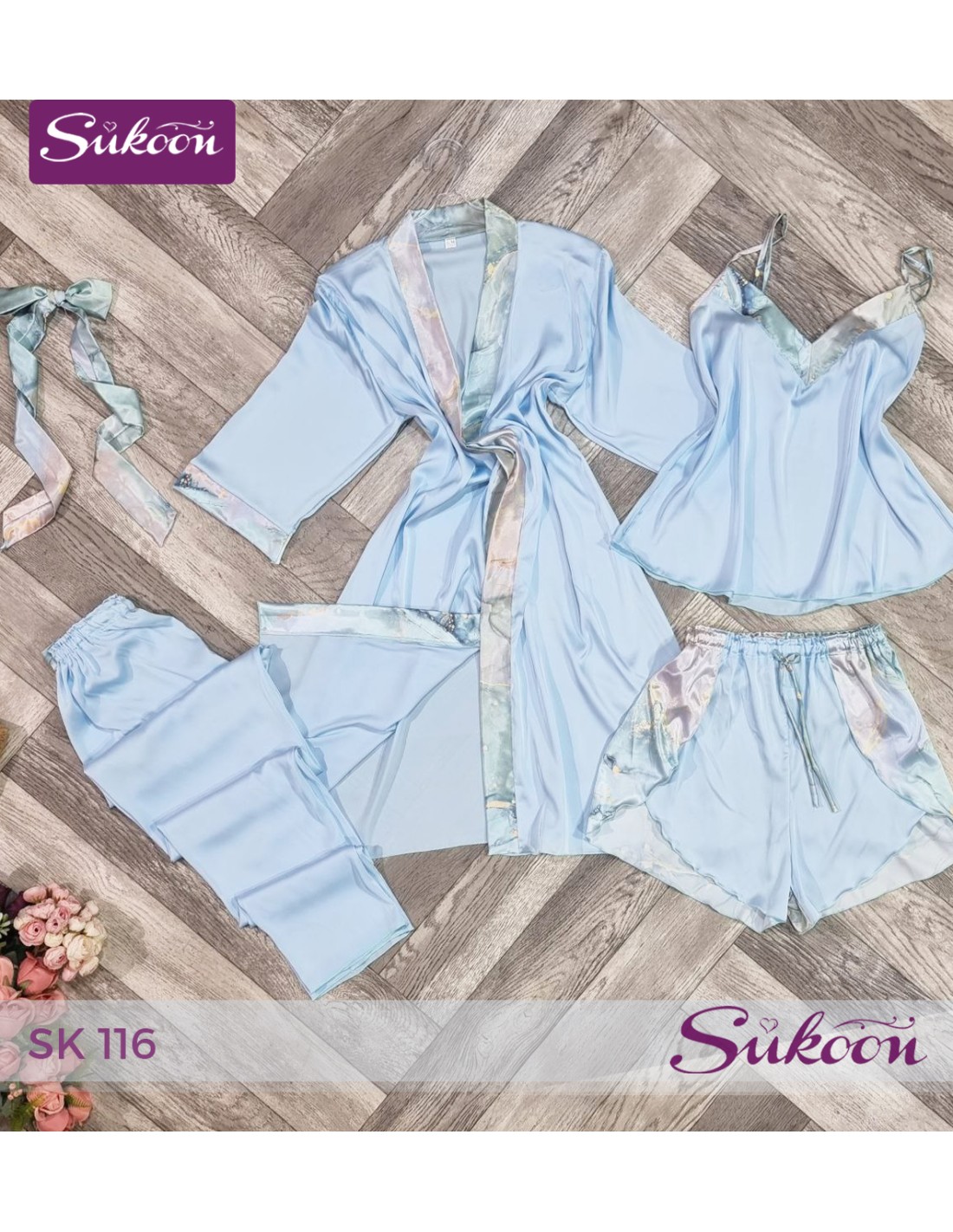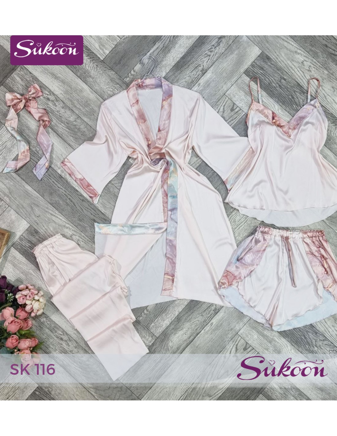 تألّقي براحة وفخامة لا تُقاوم مع بيجاما الأحلام من أربع قطع مصنوعة من أجود أنواع الحرير الساتيني.